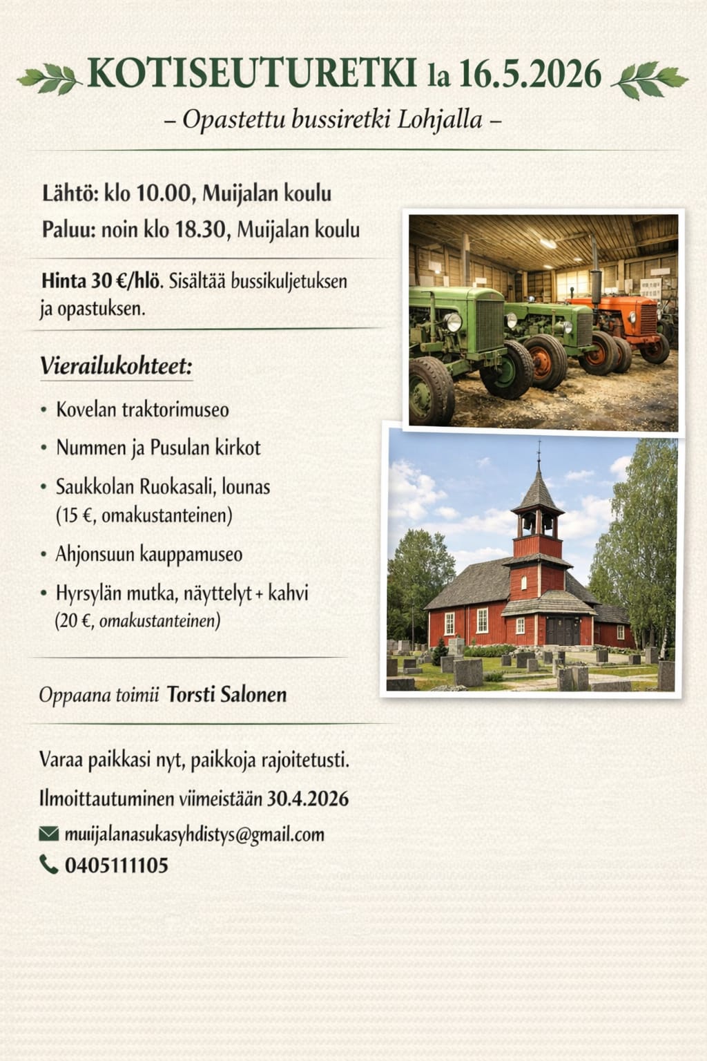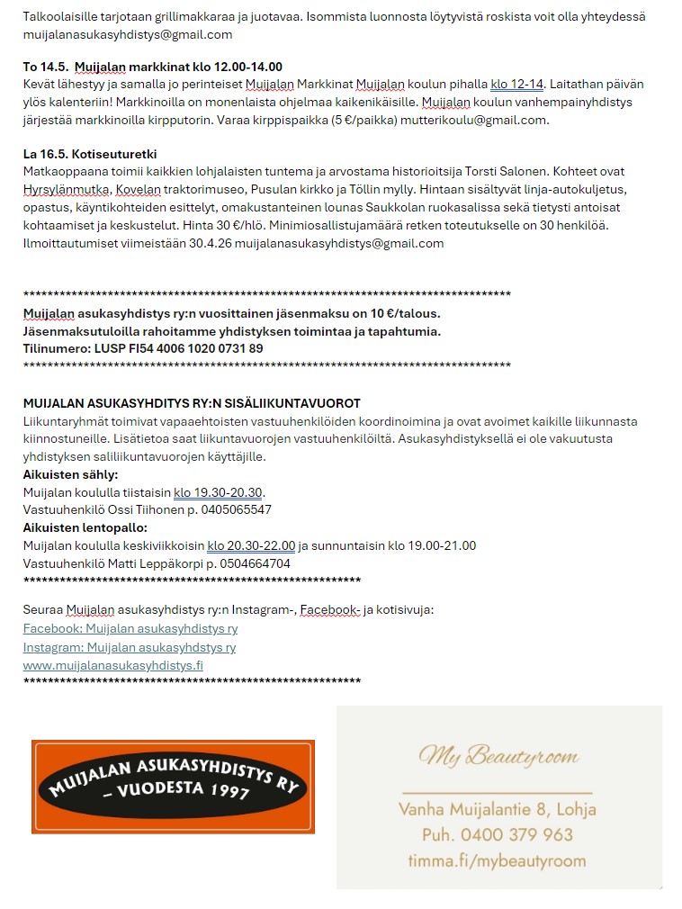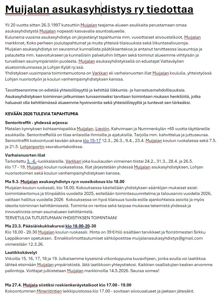 Muijalan asukasyhdistys tiedottaa, kevät 2026